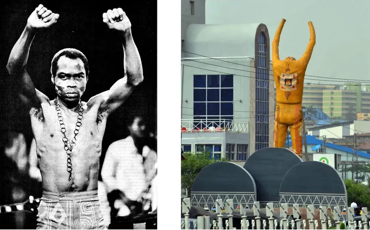 Oggi invece, in un video virale su YouTube, la superstar globale Burna Boy, nipote del manager di Kuti, ci fa fare un tour virtuale della sua ricchissima magione di Lagos. Il confronto è impietoso, forse ingiusto. Ma rivela più di qualcosa.
